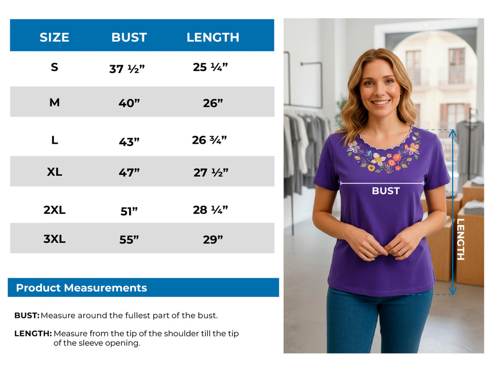 Graceful and charming, this women’s t-shirt brings a touch of elegance to everyday wear. Featuring an eye-catching embroidered cut neckline framed by scalloped edging in a deeper blue adds contrast and sophistication to this tee. Delicate floral and butterfly motifs are intricately stitched and lightly embellished with sparkling sequins, offering a hint of shimmer. Finished with short sleeves for a casual yet polished look, this pristine tee perfectly balances everyday comfort with a hint of whimsical elegance, making it ideal for adding a stylish touch to warm days.