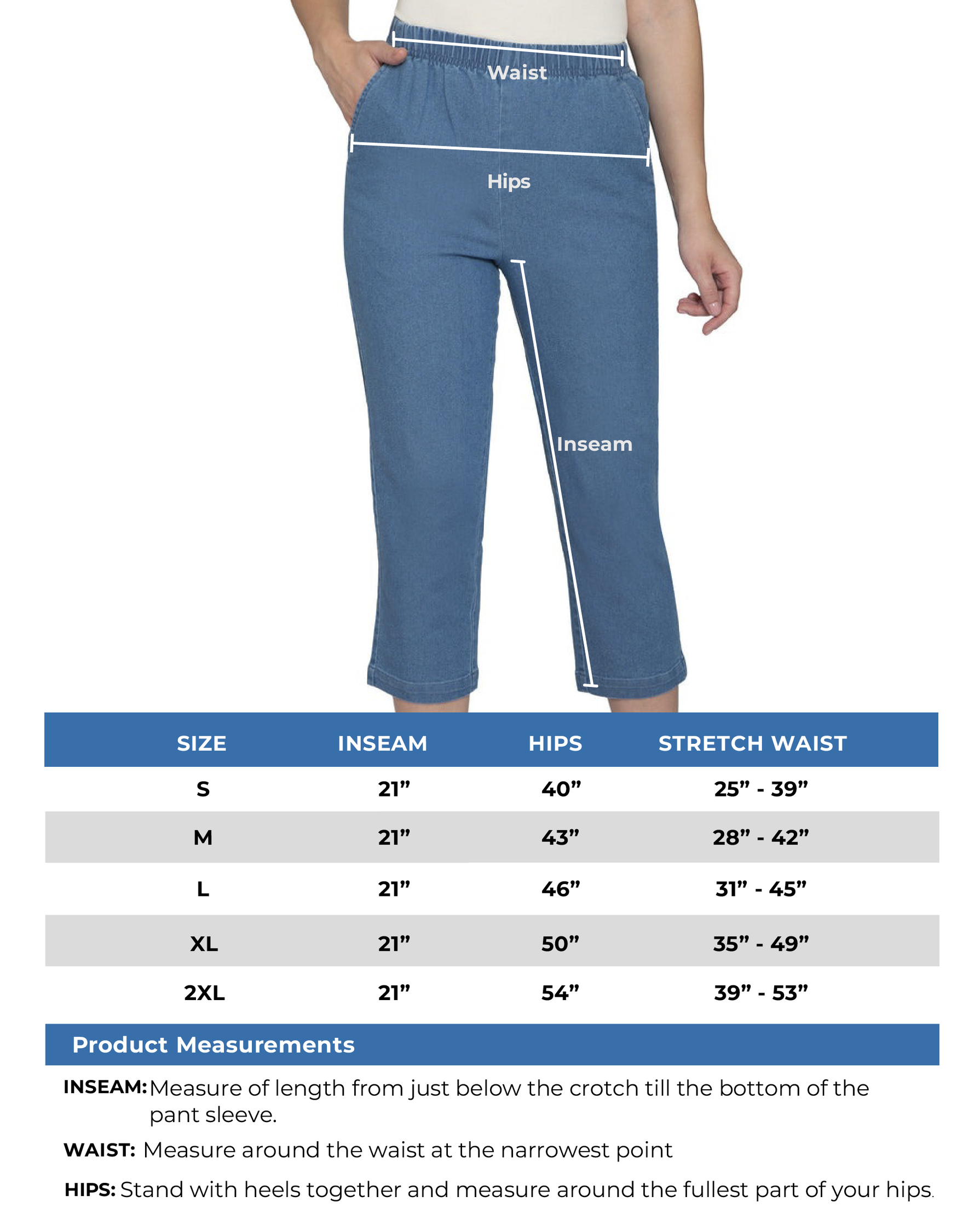 - Elastic waist and straight leg : the stretch denim and twill capri has an elastic waistband for easy pull on/off and straight leg with 21"" inseam gives a smooth tapered fit.
