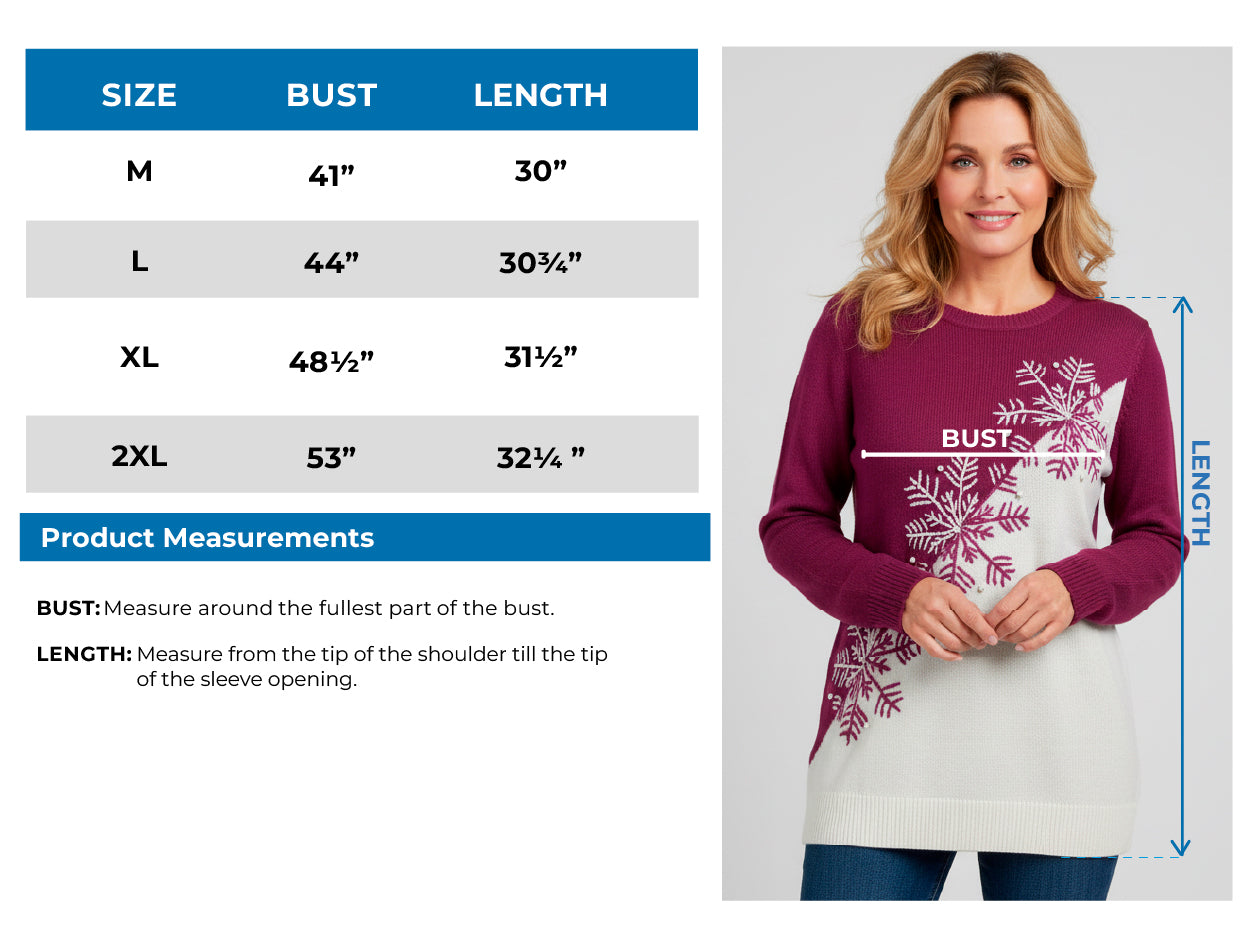 Bring home the festive charm and cozy comfort in this snowflake-decorated women’s sweater that is the perfect holiday sweater bringing a touch of winter magic to your wardrobe. In a 100% soft and durable acrylic, this sweater captures the spirit of the season while staying versatile enough for everyday wear. Picture yourself stepping into a holiday party, a cozy fireside gathering, or a chilly winter morning stroll, the ladies sweater blends seasonal cheer with timeless simplicity. The classic crewneck silhouette and flattering fit make it ideal for layering over jeans or skirts. Whether you’re gifting it or treating yourself, this sweater is a go-to addition when you want to look festive, feel warm, and stay classy.